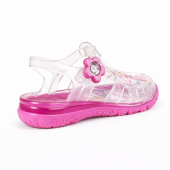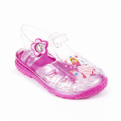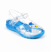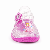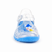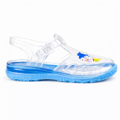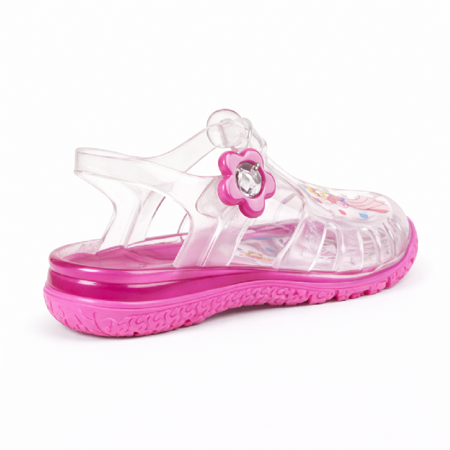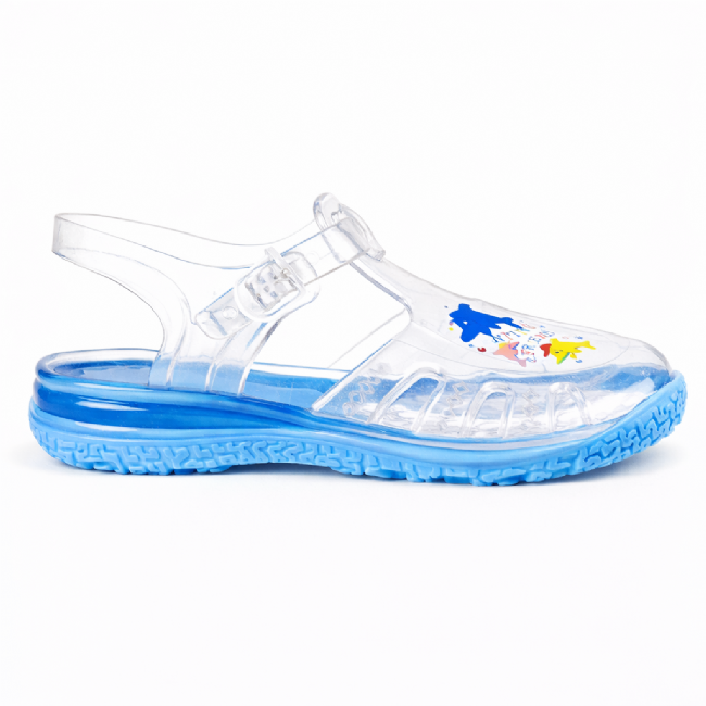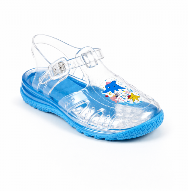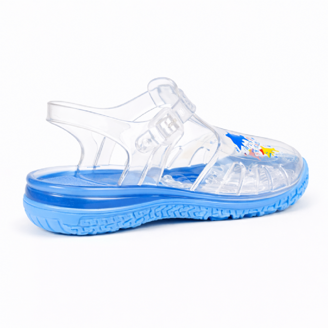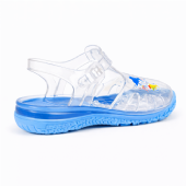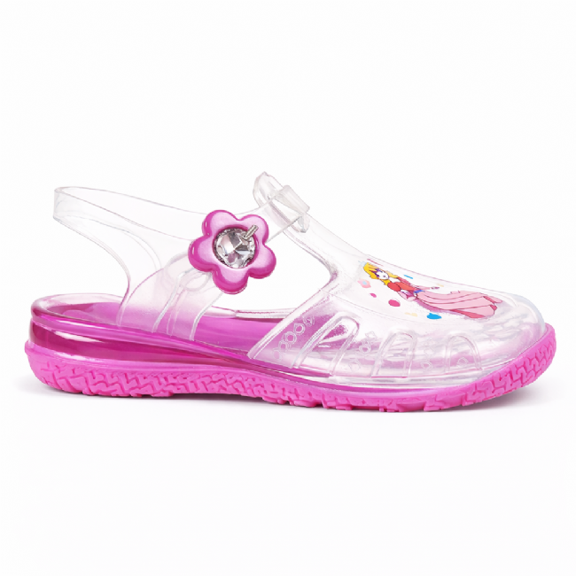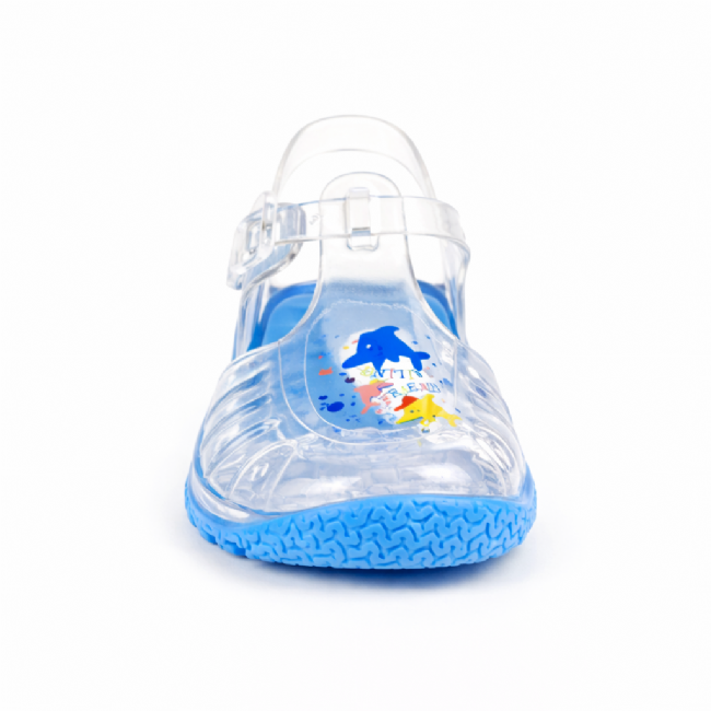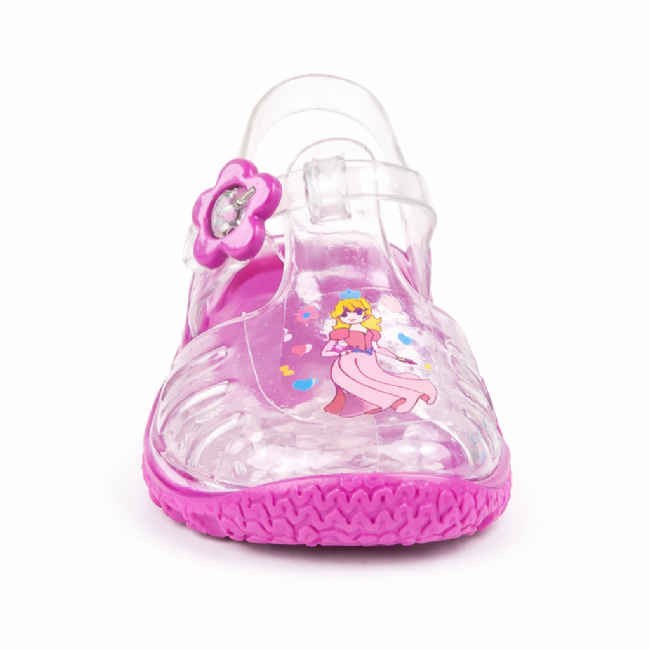Bebe πεδιλάκι παραλίας από μαλακή διάφανη σιλικόνη, με ρυθμιζόμενο κούμπωμα για καλύτερη εφαρμογή και αντιολισθητικό υλικό για να μην γλιστράει μέσα και έξω από το νερό. Διακοσμητικό σχέδιο με πριγκίπισσα για τα κοριτσάκια και καρχαριάκι για τα αγοράκια.
