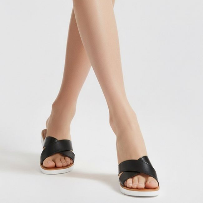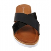 Γυναικείο αναπαυτικό flat σανδάλι - παντόφλα με δυο φάσες χιαστί από glossy συνθετικό υλικό και λευκή ελαφριά EVA σόλα. Ιδανική επιλογή για μία άνετη και γρήγορη εμφάνιση με λαμπερή χρυσή ή μαύρη απόχρωση.