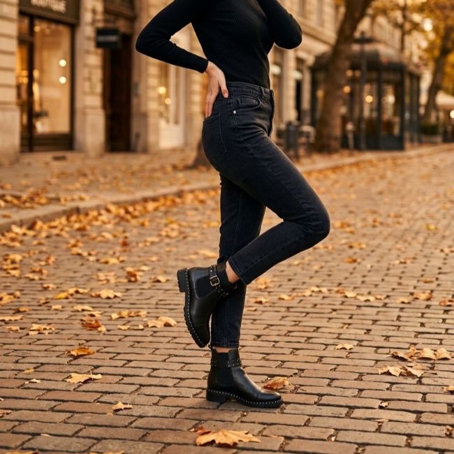 Δερμάτινο μποτάκι από δέρμα εξαιρετικής ποιότητας, με αγκράφα και διακοσμητικά τρουκς στο λουράκι γύρω από τον αστράγαλο καθώς και περιμετρικά της σόλας. Διαθέτει λάστιχα στα πλαϊνά για εύκολη εφαρμογή και επένδυση από μαλακό ύφασμα για άνεση.
