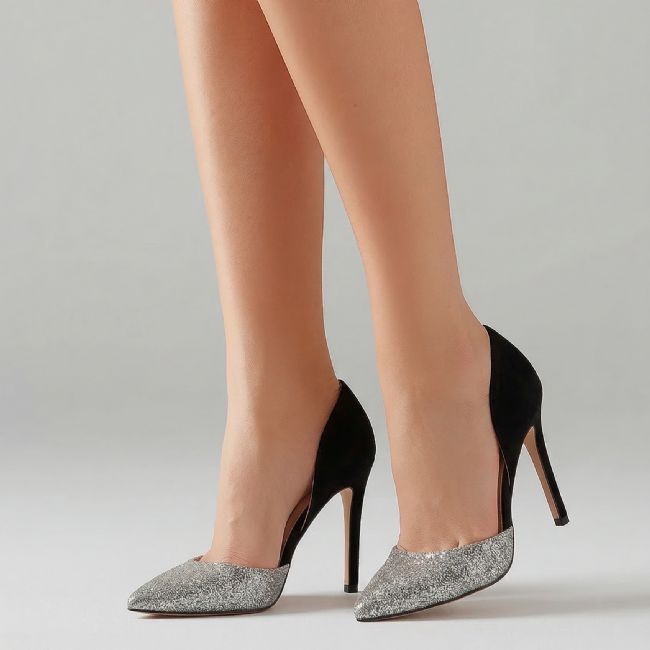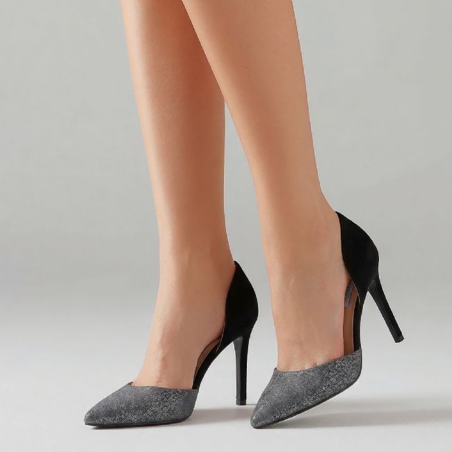 Elegant γόβες με ιδιαίτερο σχεδιασμό πλαϊνών ανοιγμάτων και συνδυασμό υλικών όπως διακόσμηση από glitter στο μπροστά μέρος και υλικό τύπου σουέτ στο πίσω μέρος.Το λαστιχάκι υποστήριξης πάνω από την φτέρνα προσφέρει τέλεια εφαρμογή και άνεση σε κάθε σας εμφάνιση.