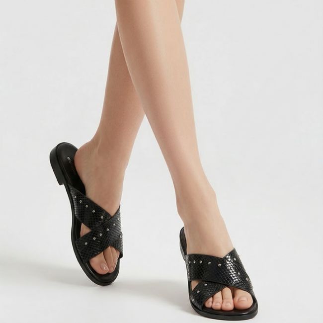 Φλάτ γυναικείο σανδάλι με animal print μοτίβο και διακόσμηση από τρουκς. Διαθέτει φάσα χιαστί και πολύ μαλακό πάτημα. Ιδανικό για όλες τις ώρες της ημέρας.