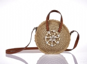 Ψάθινη στρογγυλή τσάντα με διακόσμηση από κοχύλια και επένδυση από λινό ύφασμα. Διαθέτει φερμουάρ, μικρό εσωτερικό τσεπάκι καθώς και 2 λουράκια, χειρός και ώμου.