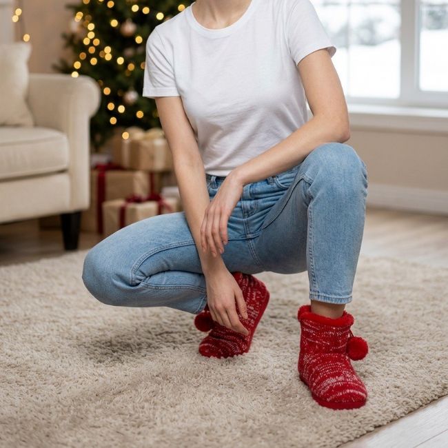 Γυναικεία παντόφλα μποτάκι πλεκτό με διακριτικές παγιέτες και διακοσμητικό φουντάκι. Διαθέτει ζεστή γούνινη επένδυση και είναι σταθερή και άνετη στην εφαρμογή.