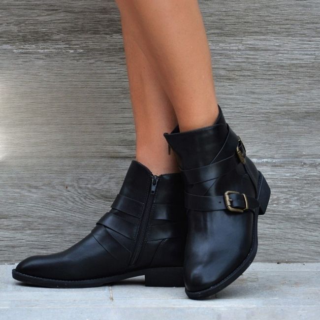 Γυναικείο μποτάκι με διακοσμητικά λουράκια, μπρονζέ αγκράφες και τακούνι. Διαθέτει φερμουάρ στην εσωτερική πλευρά για εύκολη εφαρμογή.