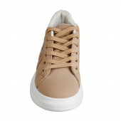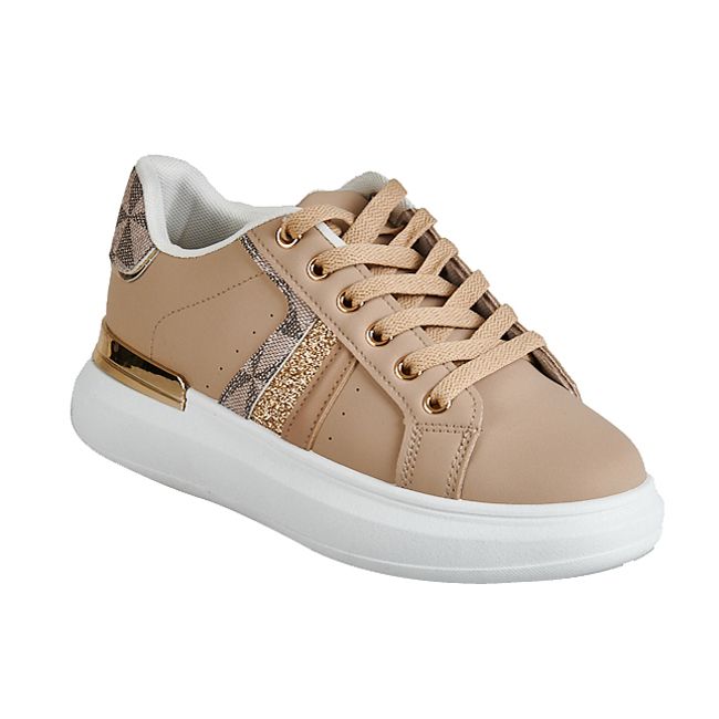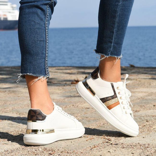 Γυναικείο sneaker περιπάτου με κορδόνια, υπερυψωμένη σόλα και καφέ-χρυσές λεπτομέρειες. Υλικό: Συνθετικό.Φόρμα: Κανονική.Ύψος μπροστά: 3 εκ.Ύψος πίσω: 3,5 εκ.Χρώμα: Λευκό, Μπεζ.