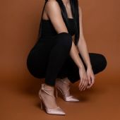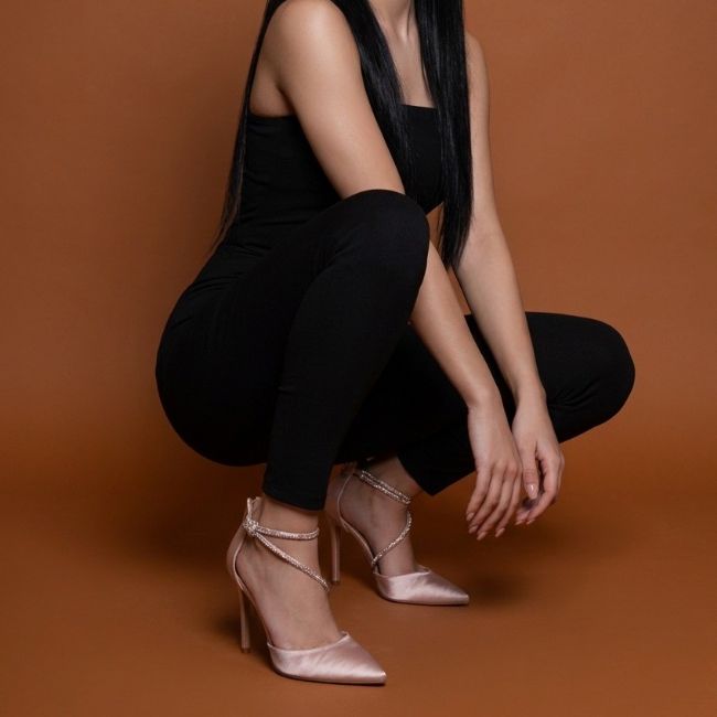 Γόβα σατέν με στρας στο λουράκι και λεπτό τακούνι. Διαθέτει φερμουάρ στο πίσω μέρος και μαξιλαράκι στο πέλμα για περισσότερη άνεση.