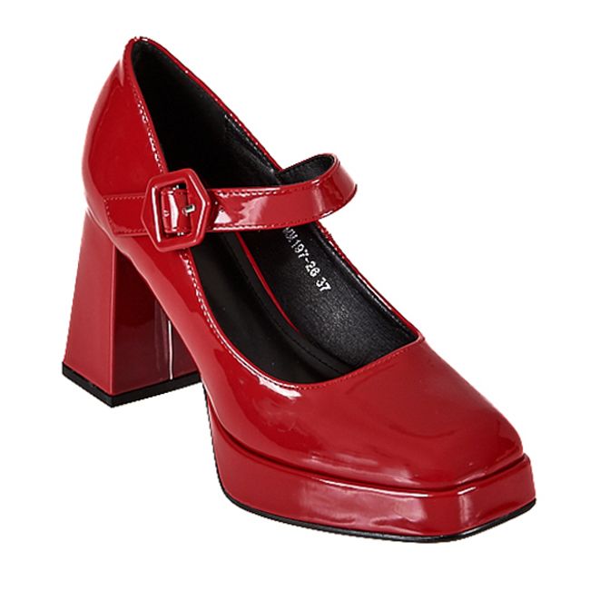 Γυναικεία γόβα λουστρίνι με ψηλό τετράγωνο τακούνι και λουράκι με κλείσιμο.