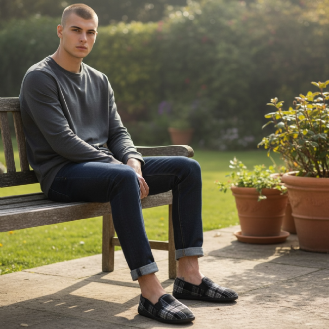 Ανδρική κλειστή παντόφλα με καρό μοτίβο - Mitsuko - Μαύρο