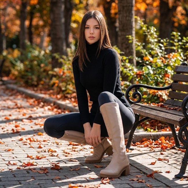 Γυναικεία μπότα με τετράγωνο τακούνι - Μπεζ