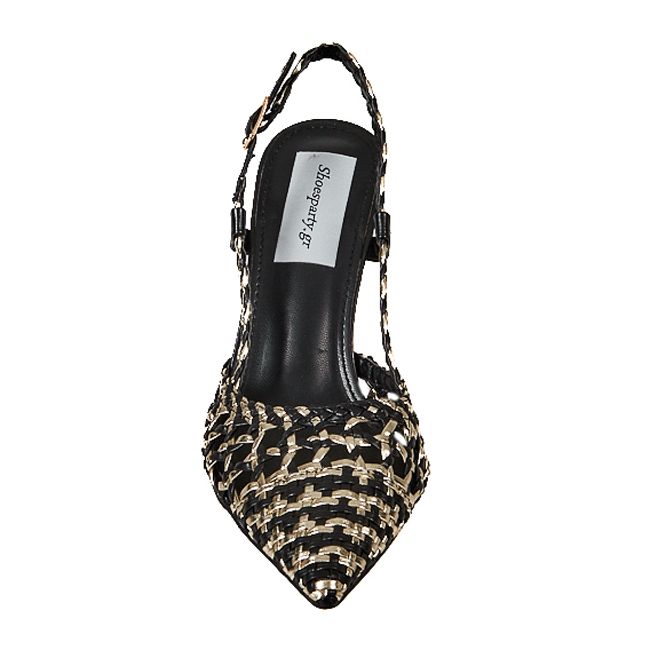 Γόβα με τακούνι και ψάθινη υφή. Διαθέτει λουράκι που κλείνει στο πίσω μέρος και μαξιλαράκι στο πέλμα για περισσότερη άνεση.