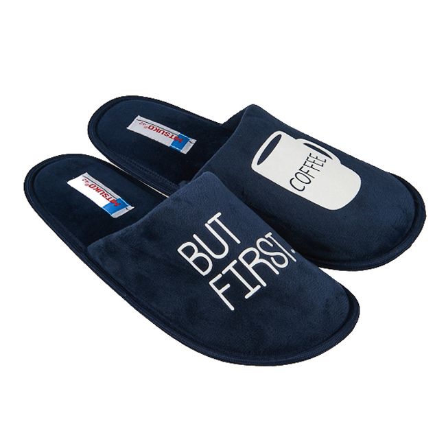 Ξεκινήστε τη μέρα σας με στιλ και άνεση, επιλέγοντας την ανδρική παντόφλα But first coffee σε μοντέρνο μπλε χρώμα.