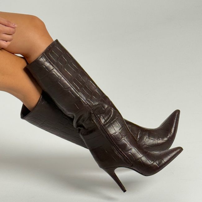 Αναδείξτε το στυλ σας με αυτή τη γυναικεία μπότα σε καφέ απόχρωση και εντυπωσιακό κροκό μοτίβο.