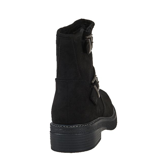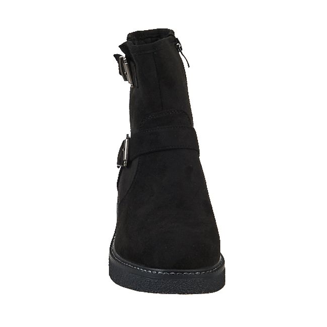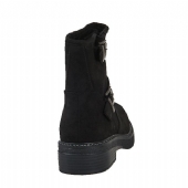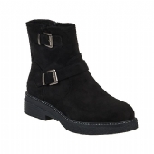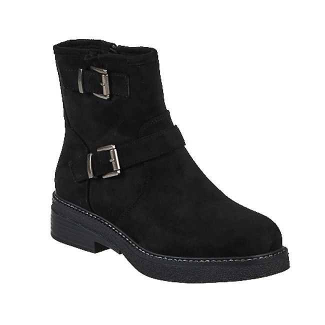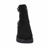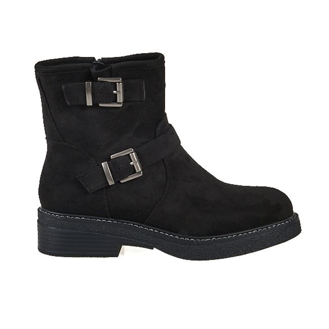 Αναδείξτε το στυλ σας με αυτό το μαύρο γυναικείο μποτάκι από υλικό τύπου σουετ με δύο αγκράφες για μοναδική εμφάνιση.