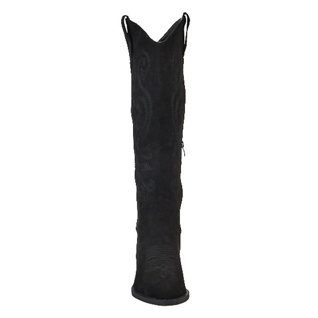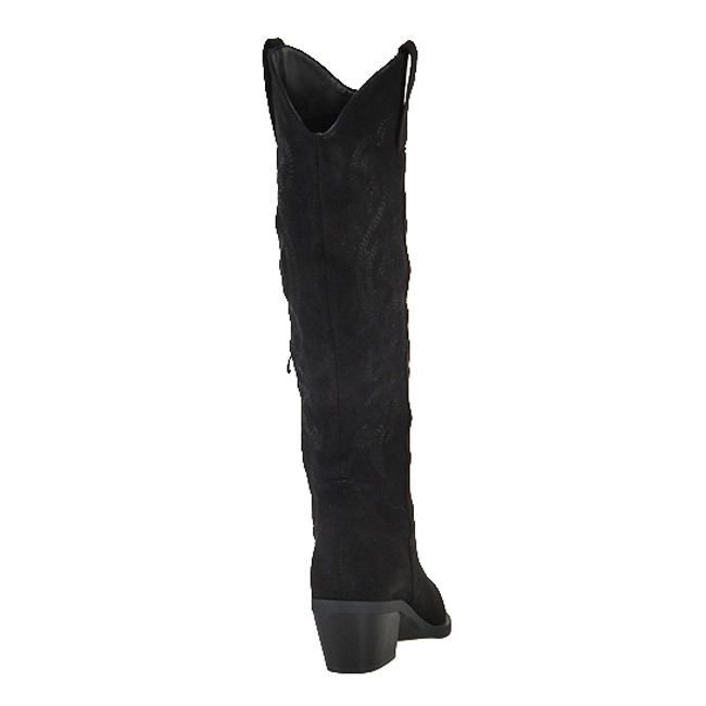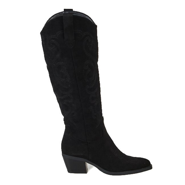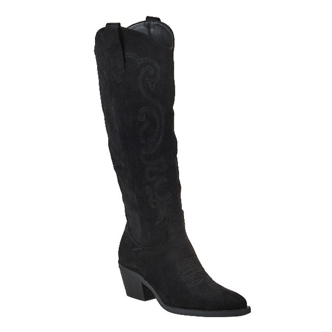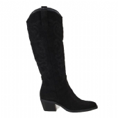Αναδείξτε το στυλ σας με γυναικεία μπότα western σε μαύρο χρώμα από υλικό τύπου σουέτ.