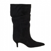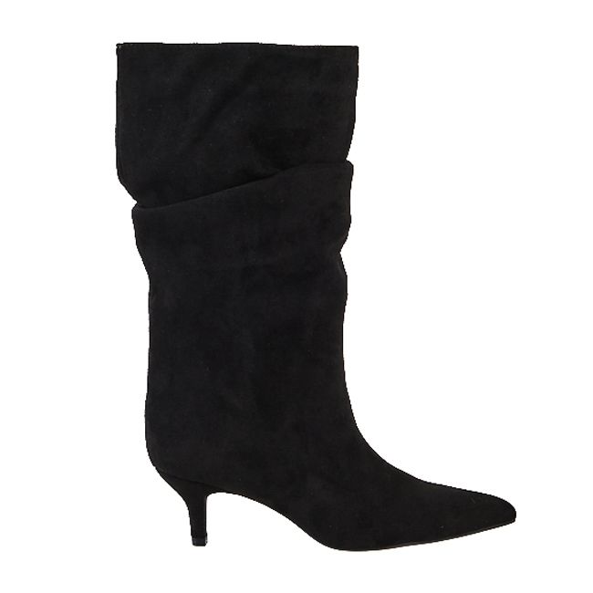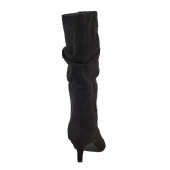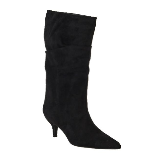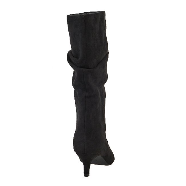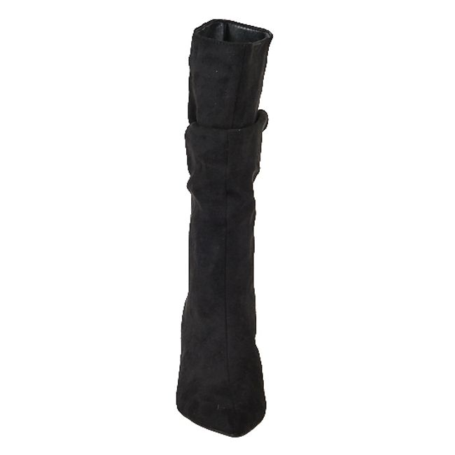 Αναδείξτε το στυλ σας με τη γυναικεία μπότα με σούρα σε μαύρο χρώμα, κατασκευασμένη από συνθετικό σουέτ και χαμηλό τακούνι 6,5 εκ.