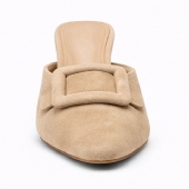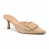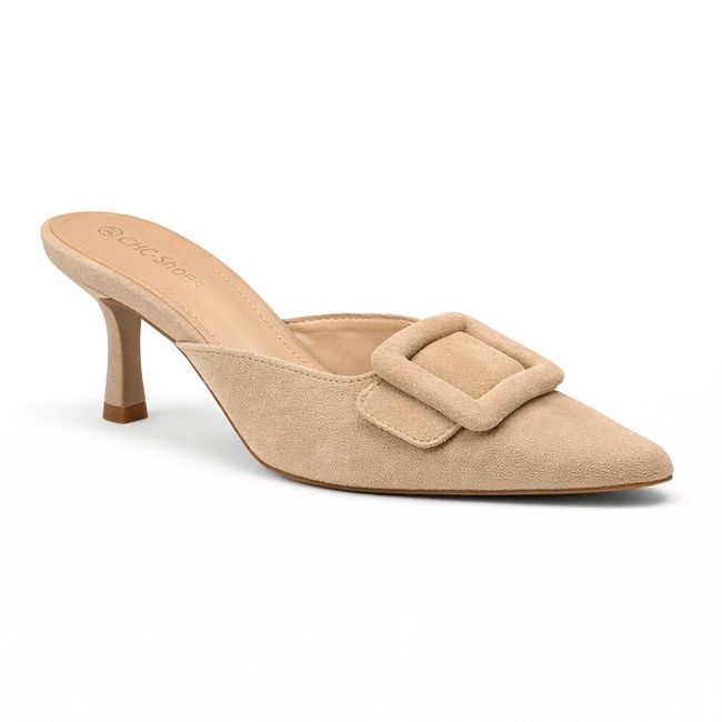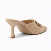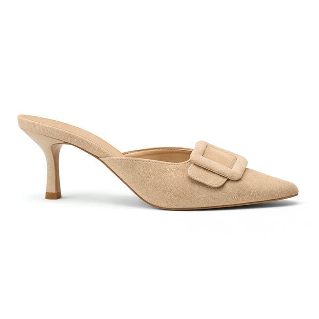 Αναδείξτε το στυλ σας με αυτή τη γόβα mule σε μπεζ απόχρωση, με μεγάλη διακοσμητική αγκράφα και υφή σουέτ.