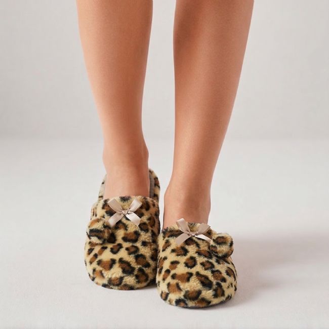 Παντόφλα γυναικεία λεοπάρ με διακοσμητικά pon-pon ίδιου χρώματος.