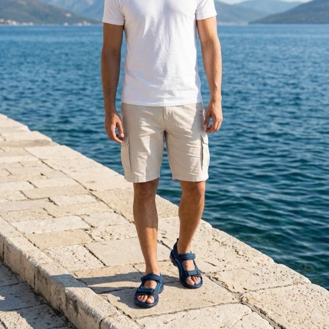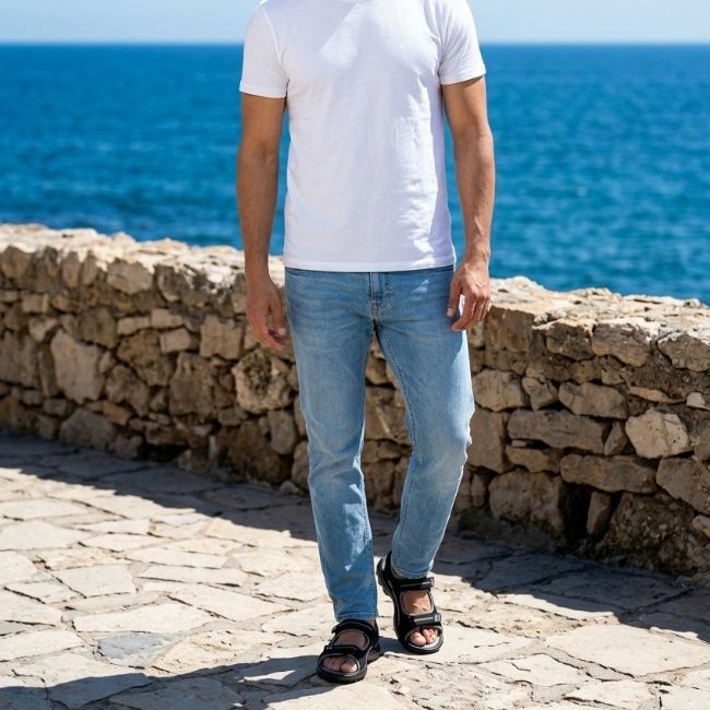 Ανδρικό τουριστικό πέδιλο με δύο φάσες και αυτοκόλλητα κλεισίματα για απόλυτη προσαρμοστικότητα στο πόδι.