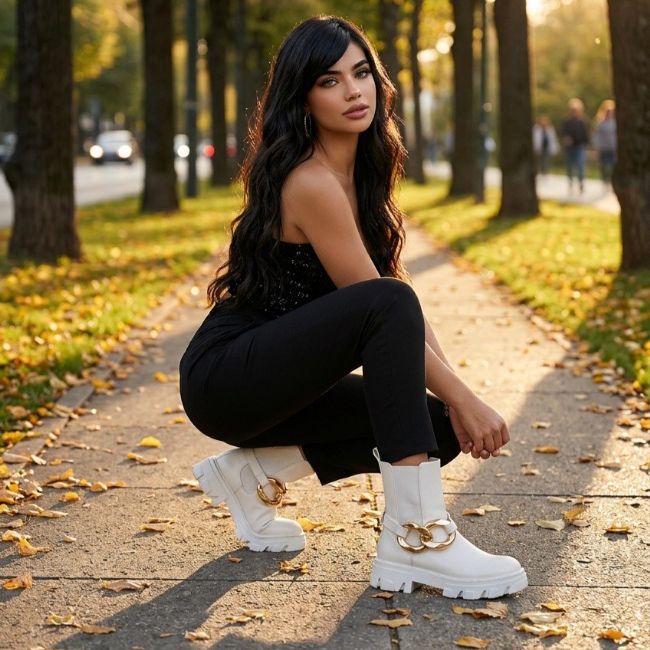 Γυναικείο λευκό μπότακι με τρακτερωτή σόλα, φερμουάρ στην εσωτερική πλευρά και λάστιχο για εύκολη εφαρμογή. Διαθέτει διακοσμητικό αποσπώμενο λουράκι με χρυσή αλυσίδα. Ανακαλύψτε την τελευταία λέξη της μόδας στο shoesparty.gr