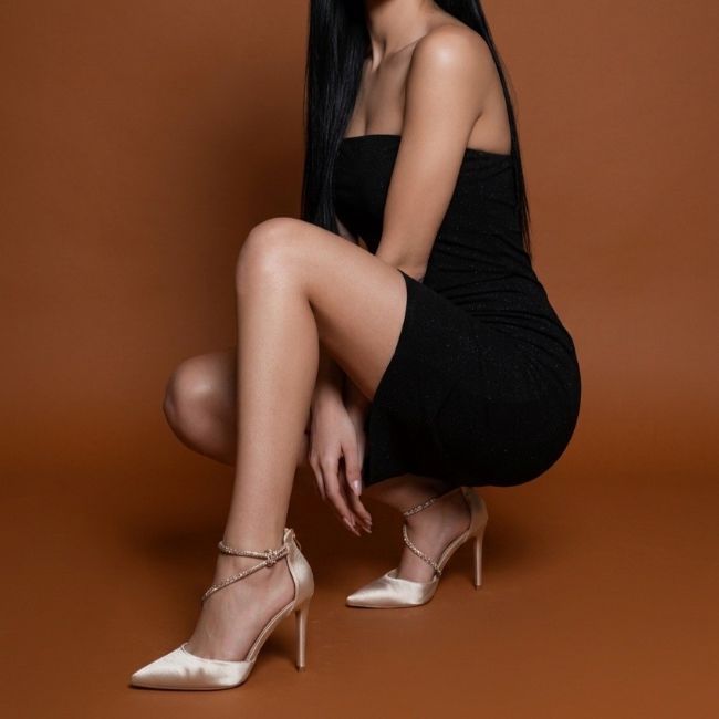 Γόβα σατέν με στρας στο λουράκι και λεπτό τακούνι. Διαθέτει φερμουάρ στο πίσω μέρος και μαξιλαράκι στο πέλμα για περισσότερη άνεση.