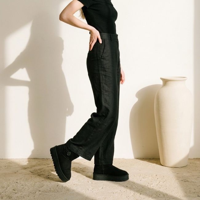 Γυναικείο flatform μποτάκι από υλικό τύπου σουέτ με κουμπί και εσωτερική γούνινη επένδυση.
