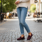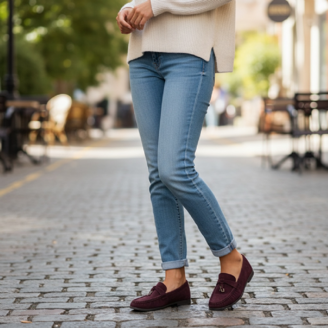 Αναδείξτε το στυλ σας με αυτό το εκλεπτυσμένο γυναικείο μοκασίνι σε μπορντό χρώμα, κατασκευασμένο από συνθετικό υλικό τύπου σουέτ.