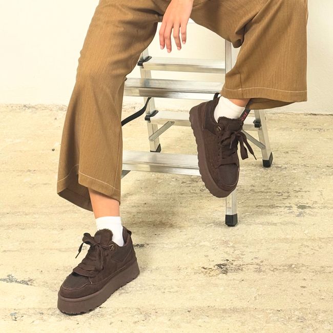 Αναδείξτε το στυλ σας με αυτό το γυναικείο σπορ υπόδημα σε κομψό καφέ χρώμα. Συνδυάζει υλικό τύπου σουέτ με απαλή γούνα, κορδόνια και ψηλή σόλα 3,5 εκ. για άνεση και ζεστασιά όλη μέρα.