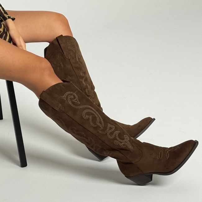 Αναδείξτε το στυλ σας με τη γυναικεία μπότα western σε λαδί χρώμα από υλικό τύπου σουέτ.