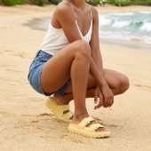 Ανανεώστε το καλοκαιρινό σας στυλ με τη μοντέρνα flatform σαγιονάρα σε ζωντανό κίτρινο χρώμα.